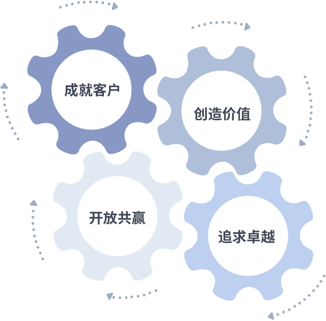 成就客户是一切决策的出发点,,,,创造价值是衡量所有工作的标准,,追求卓越是我们做事做人的态度,,开放共赢是我们的格局也是最终的结果。。。。价值观的齿轮环环相扣,,推动着组织里的每个人不断向前。。